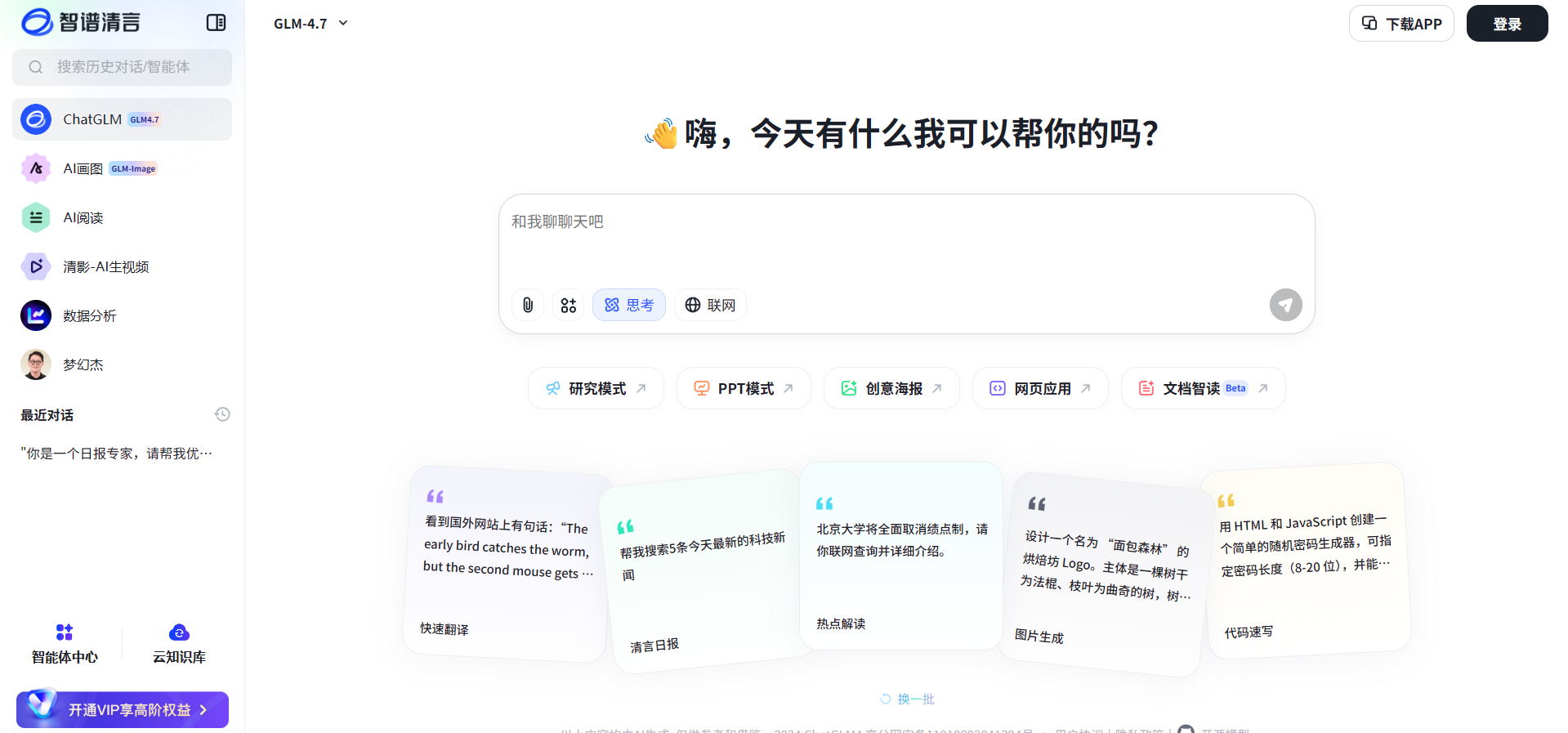 首页 智谱清言 智谱清言 AIGC AI助手 AI写作 大语言模型 AI翻译 智谱清言 清言 AI对话 GLM-4.7 多模态AI AI编程 智谱 AI工具 2026-01-14 20:58 访问网站 智谱清言是基于 GLM-4.7 的全能 AI 助手,支持精通对话、写作与编程。为你答疑解惑,激发创意,更能理解图片与文档,提升学习与工作效率。 相关文章 商量 - AI生活小帮手 灵光全模态AI助手 讯飞星火 DeepSeek Gemini-需要挂梯子 天工AI 百度文心助手 纳米AI 评论 暂无评论,快来抢沙发吧!